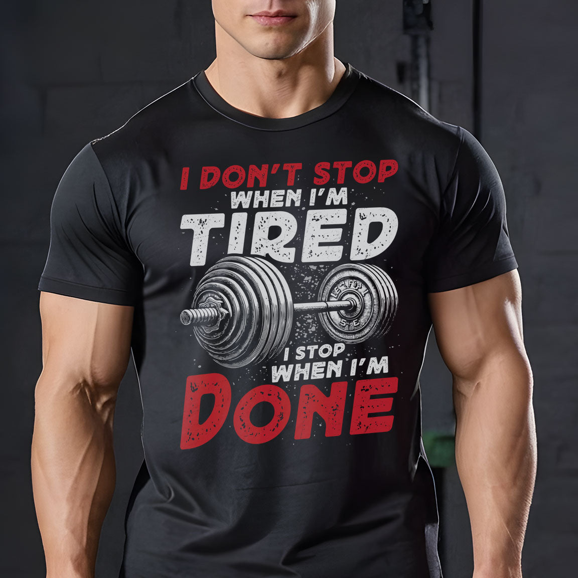 Push your limits with this motivational workout shirt! Featuring the empowering mantra, "I don't stop when I'm tired, I stop when I'm done," it's perfect for dedicated gym enthusiasts.