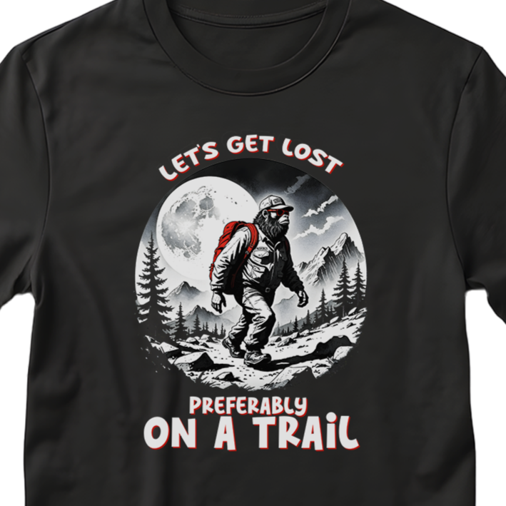 Get lost in style with our Let's Get Lost Preferable on a Trail T-shirt, perfect for any Bigfoot hiking adventure. Embrace the unconventional and stand out on the trails with this quirky and fun shirt. Don't forget to pack your sense of humor!